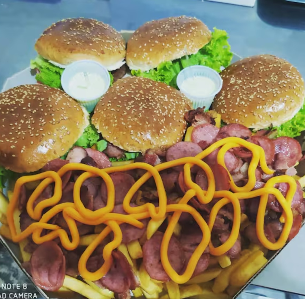 Um combo com 4 hambúrgueres no pão com gergelim, recheados com alface e molho individual, acompanhados por uma porção grande de batata frita, coberta com linguiça calabresa fatiada e molho cheddar por cima.